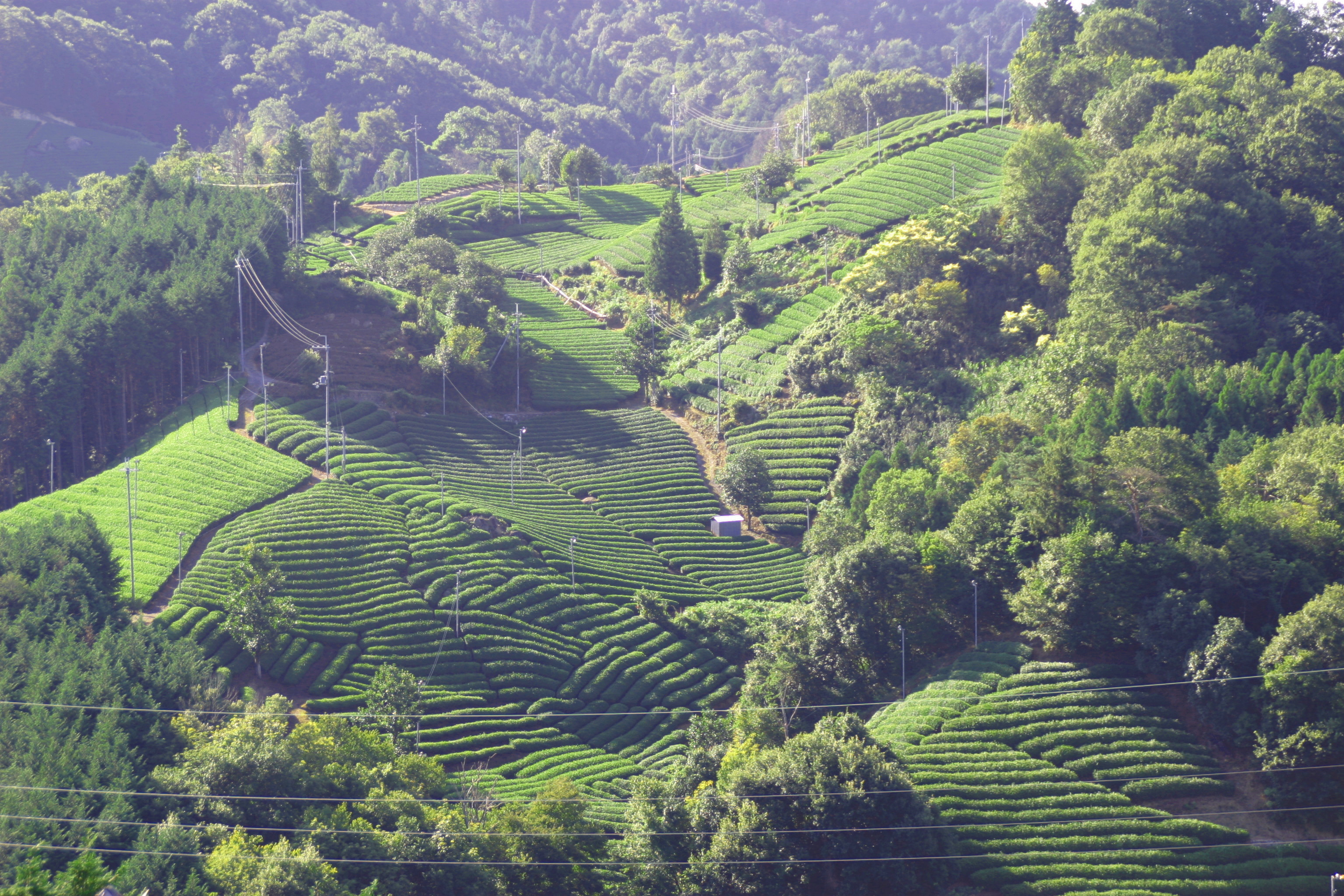 和束町の茶畑は、川沿いから見上げるだけでは想像がつかないほど、急傾斜の山の上にも広がります。撰原の茶畑は、傾斜に合わせ、パッチワークのように畝が巡らされ、まさに「山畑」のよう。白栖から谷向かいに臨むことができます(目印の看板があります)。
