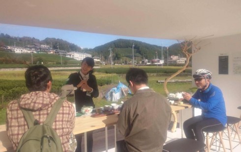 茶畑と集落が織りなす生業景観を眺めながら、和束ティー・フレンズによるお茶を味わえます(有料500円、茶菓子付)