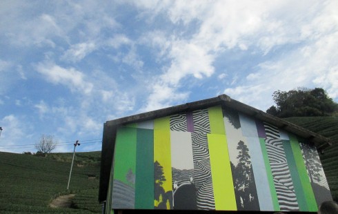 石寺茶畑景観のアクセントとなっている赤い小屋の壁面にパネルでアート。茶畑の一年を表現。近くまで行ってみることもできます