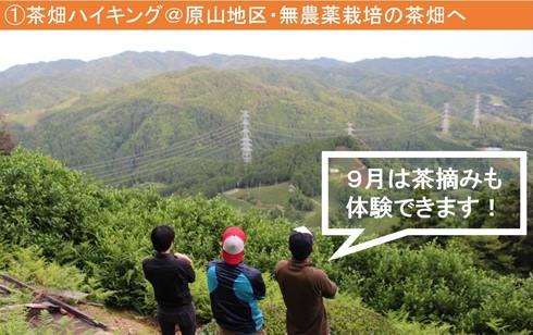 9月には茶摘み体験もセットで行う、d:matcha Kyoto人気のハイキングツアー!和束町の原山地区にある、d:matcha Kyotoが管理する無農薬栽培の茶畑まで、片道1時間ほどハイキングします。