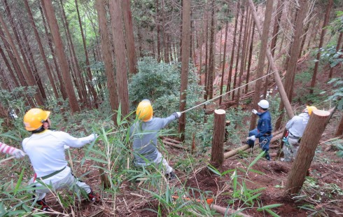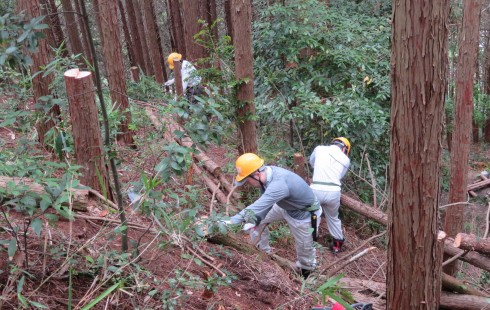 和束町撰原で、生態系の復元と林業の復活を目指したスギ・ ヒノキ林の間伐作業を行います。