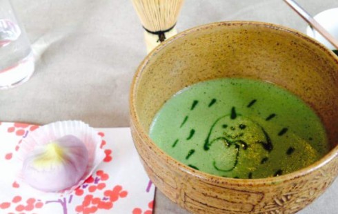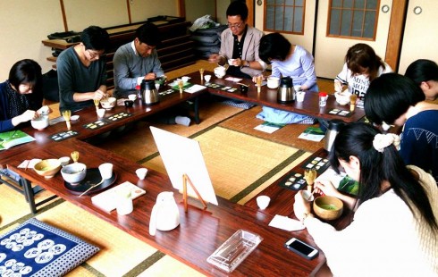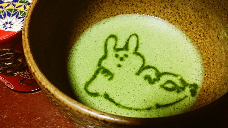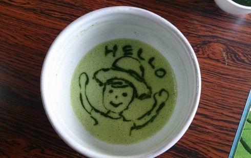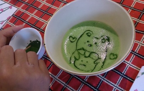 抹茶を自分で点ててみて、お薄のうえに絵を描く遊びです。