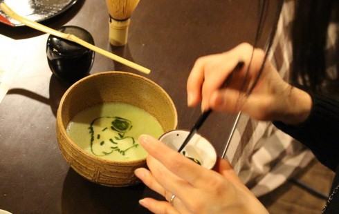 点てた抹茶に絵を描く、抹茶アート。抹茶を自分で点(た)ててみて、お薄のうえに絵を描きます。