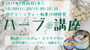 毎月第4木曜日に開催しているハーブの講座 「ハーブ」=「健康に役立つ薬草」として たくさんある魅力を、 毎月、テーマに合わせて紹介しています。 9月のテーマは、「お風呂」です! バスボム(入浴料)とスクラブ作りをします。…