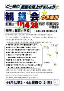 和束町の隠れた魅力は、夜、空が暗いこと。都会に近いわりに星空がよく見えます。 ご一緒に星を見ませんか? ☆今回は、半月過ぎの月、木星・土星・火星といった惑星、秋の四辺形や秋の星座をつくる星々、美しい二重奏のアルビレオなど…